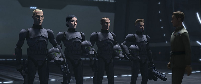 Back on Kamino, Crosshair is examined following the procedure he endured under Tarkin’s eyes. The governor is joined by Rampart, the architect of the chain code implementation. They start talking about “Project War Mantle.” Rampart is arguing that the Empire can’t only count on the clones to defend itself while Nala Se tries to argue back with the fast availability of the clone army. The imperial wants to select top soldiers and having them trained by clones. Rampart introduces Tarkin to the first elite squad he recruited.