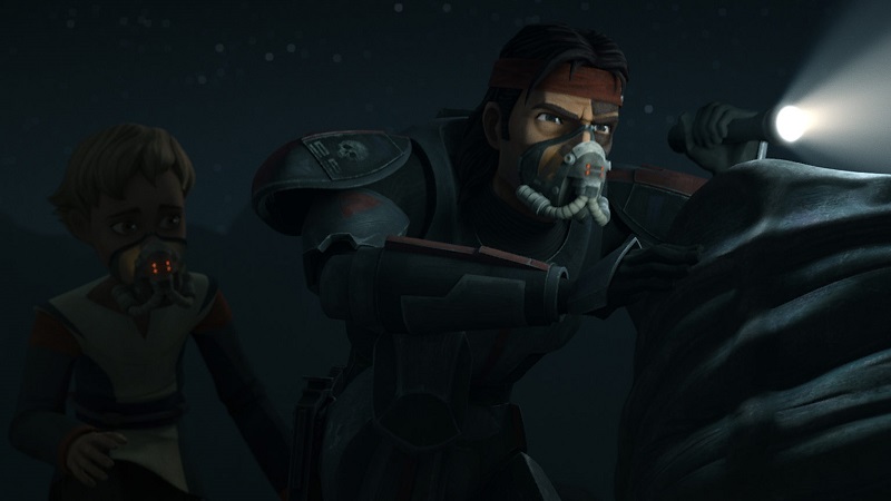 Echo and Tech are making the repairs when Echo hears noises and start to investigate. The clone finds scratch marks and Tech realizes they weren’t there when they landed. Meanwhile, on the ship Wrecker’s head is hurting and he doesn’t seem to remember hitting his head. Tech informs Hunter that the capacitor is in place, but that other systems are failing. The power goes out and noises can be heard outside. Omega is scared by something and describes what she saw. Echo realizes the capacitor is gone. Tech deduces the beast must be an Ordo moon dragon who feeds on raw energy. Wrecker is still hurting and Hunter orders him to stay inside while Echo and Tech work on the ship. Omega goes with Hunter.
