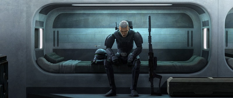 Crosshair and his teammates go to the former Clone Force 99’s quarters. The clone looks around him and sees reminders of his former team. He goes to sit on his bunk and seems pensive.