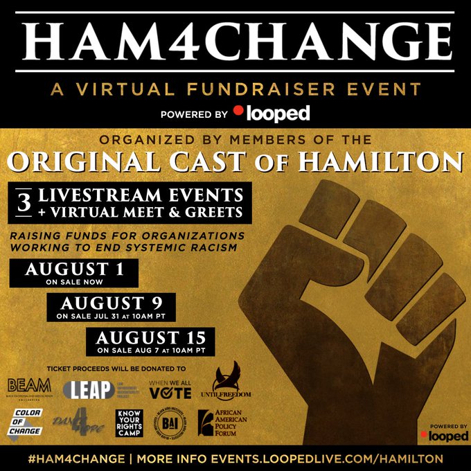 Do not throw away your shot to be in the room where it happens. The lineup for the final HAM4CHANGE event on August 15 has been released! The HAM4CHANGE event fundraises for the fight for social justice with the proceeds from August 15, going to benefit Know Your Rights Camp, Black Aids Institute, and African American Policy Forum – which are all working to end systemic racism.