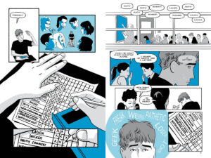 David Levithan: Ned was, I think, incapable of writing a boring line, whether it’s in the narration or the dialogue. And because Jeremy’s voice permeates the whole story so fully, I knew that I could strip away a lot of the narration because the dialogue was going to convey so much of who Jeremy is and how he thinks. Since I had Ned’s words on my side either way, I had it easy. Nick [Bertozzi] had the bigger challenge, because he had to convey the novel’s voice within the illustrations . . . which I think he managed to do beautifully.