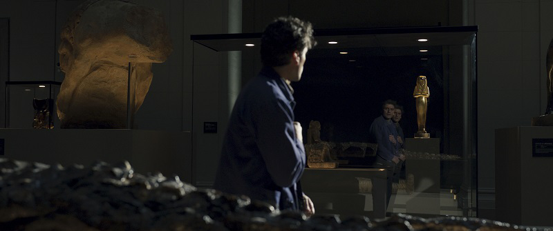 Steven Grant wakes up, unchains himself from his bed, and looks around the room to check the various safeguards that he uses to see if he got up in the middle of the night. He calls his mom as he begins to make his way to the museum that he works at. When he arrives, he begins talking to a little girl about the artifacts on display, much to his manager Donna’s dismay — he should be selling candy, not acting like a tour guide. A co-worker approaches him to confirm if their date is still on for the following evening, although he has no recollection of asking her out. Later, he attempts to strike up a conversation with Donna about the some factual issues on the ancient Egyptian posters and banners they have on display … she doesn’t care. After clocking out for the evening, Steven chats up a street performer dressed as a golden statue (though he doesn’t appear to be very good company).