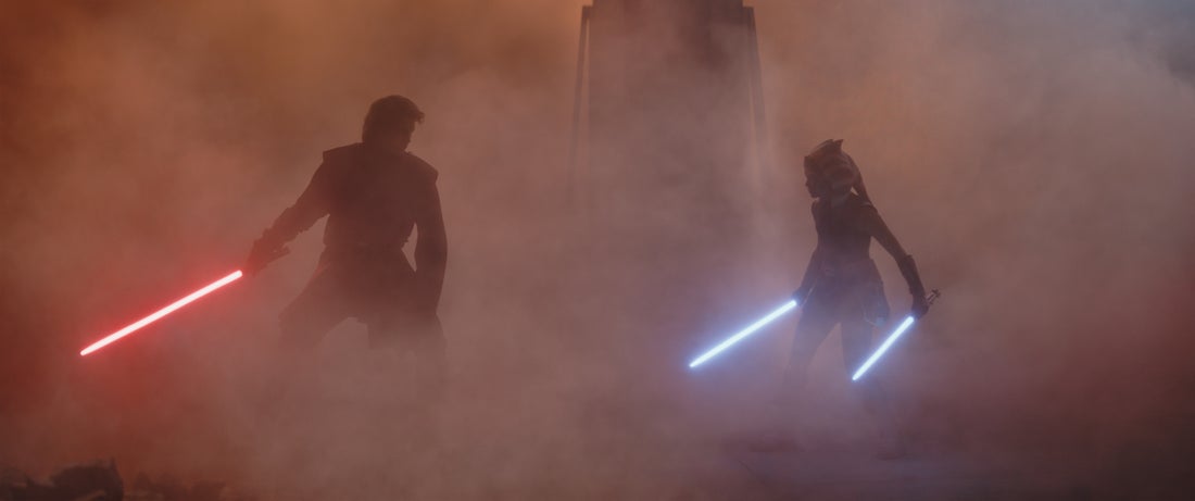 Anakin, expressing his dissatisfaction, returns Ahsoka to her training … this time igniting the iconic red lightsaber and donning the appearance he did when he fought his Master, Obi-Wan Kenobi, on Mustafar — including the Sith eyes. He sends Ahsoka back to the astral World Between Worlds and continues their duel, telling her that she lacks conviction and overpowering her, until she turns his own lightsaber on him. She draws closer before tossing his lightsaber aside, announcing that she chooses to live.