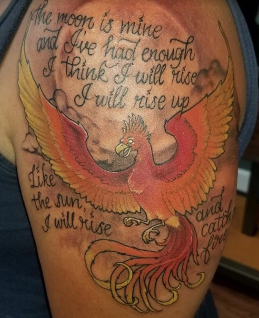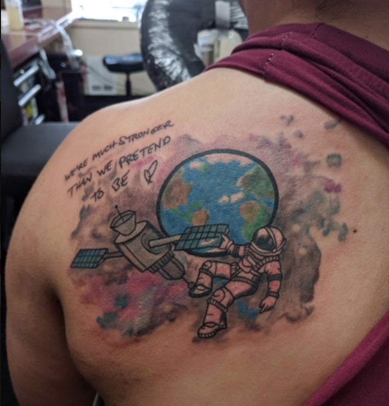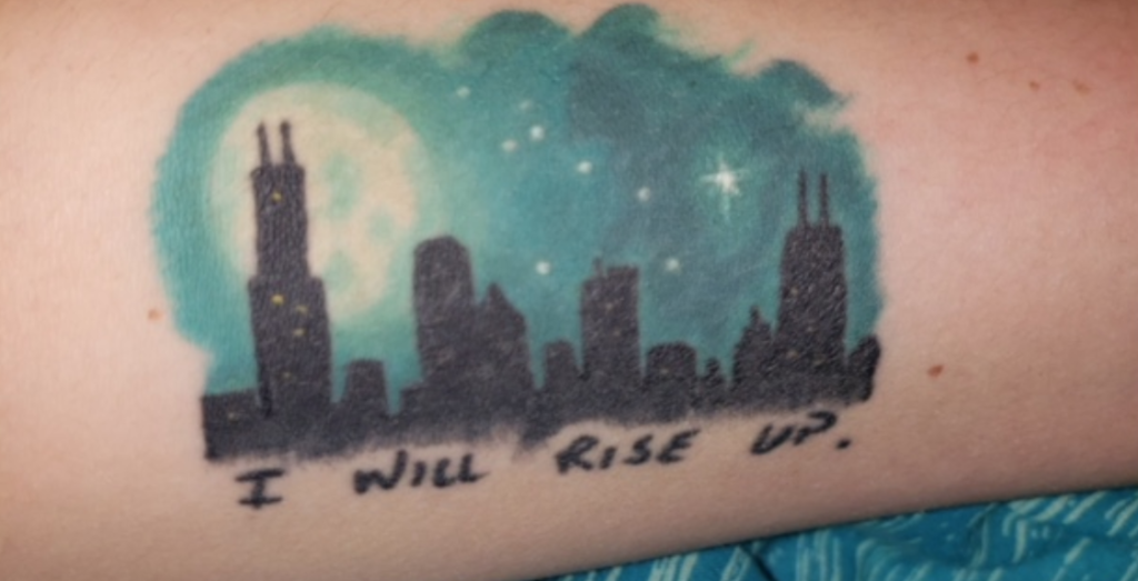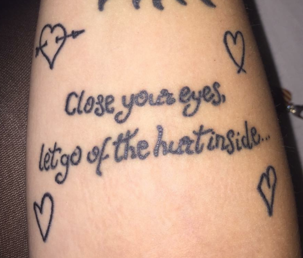 Sarah says of her “Downtown Letdown” tattoo: “It’s the song that simultaneously made me fall in love with the band and start thinking about actually treating my depression instead of just trudging through it like I had been for the past several years. This tattoo is a reminder of the friends I’ve made, the adventures I’ve had, the mental health progress I’ve made, and that no matter how bad things get, I will rise up.”