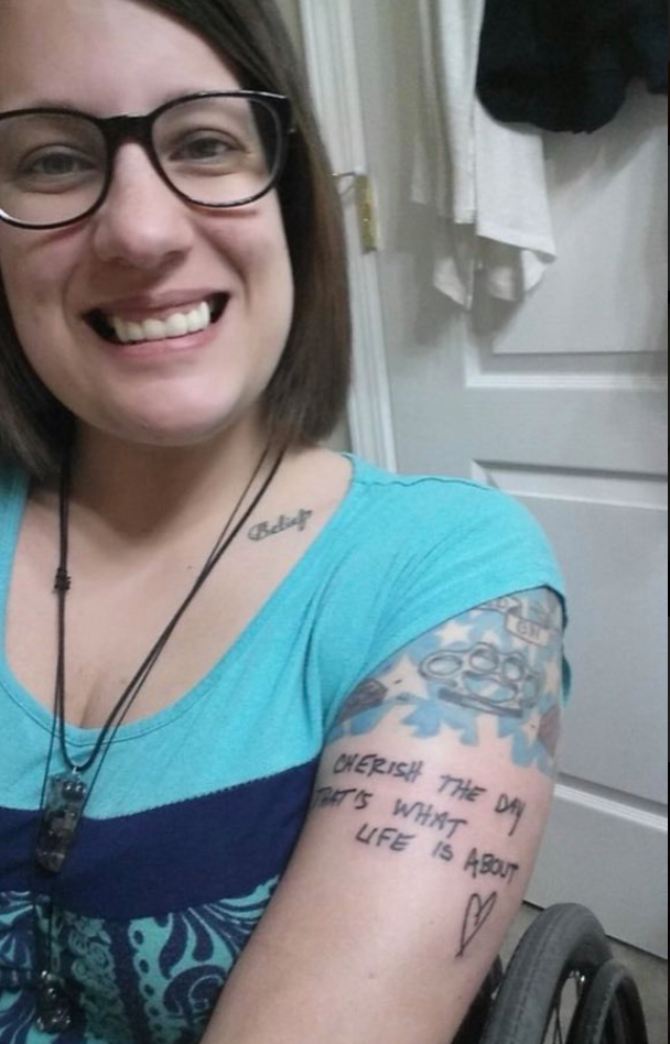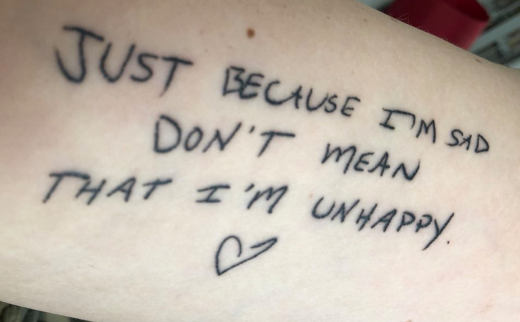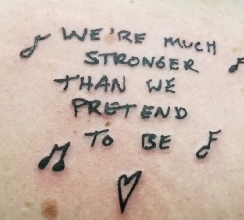 April and Katie say they chose lyrics that helped remind them they are more than their depression. Both chose to go with lyrics from the song “Downtown Letdown”. April says it reminds her, “that I have risen up and above and will continue to do so,” while Katie says, “I had been depressed and feeling ‘stuck’ for so long. I chose these lyrics to remind myself that I had the courage to leave that situation and pursue my own happiness.”