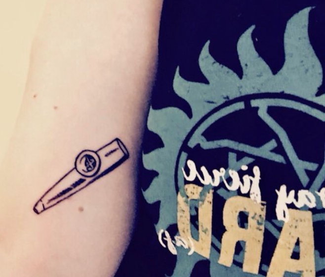 A lyric does not have to change your life to become a beloved tattoo. It can simply be as simple as being a favorite tune to sing along with or a reminder of happy moments with friends. Brittany wanted a reminder of the love and acceptance she has found as a part of Supernatural’s SPNFamily and as a fan of Louden Swain. “For me, singing Medicated with the band at a show always represents love. We all have these insecurities in life, whether it be appearance, mental health, creativity, or relationships etc and that’s our crazy but our Medicated for all of that is love, kindness, and kazoos.” For her tattoo, she chose a kazoo, the instrument the band and Swainers play at a key moment in “Medicated”, saying “It certainly raises a lot of questions, of which I gladly answer and take a chance to pass on a little brightness and whimsical joy into someone else’s life. Also, you can’t be sad when you say kazoo tattoo. You just can’t.”