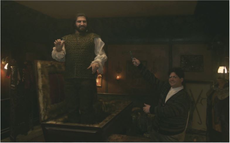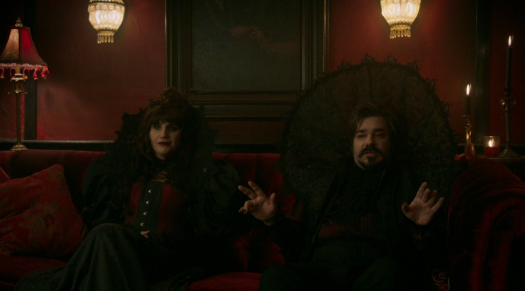 In this new world of WWDITS, we have literally been transported to “the New World”…..of Staten Island. (The original film takes place in the suburbs of New Zealand.) Our vampire roommates being followed by our mockumentary crew are: a former warrior of the Ottoman Empire – Nandor (played by Skins‘ Kayvan Novak), lusty but long married couple Nadja and Laszlo (Natasia Demetriou and Matt Berry), Nandor’s human familiar Guillermo (Harvey Guillén), and the “energy vampire” Colin (Better Call Saul‘s Mark Proksch). They were sent to this “New World” by their master (the ominous Baron) in order to conquer it for vampires. Unfortunately, the new world is “f*cking huge” and they never made it past the town where the boat dropped them off. This proves a problem when the Baron (Doug Jones!) comes to visit and check on their progress.