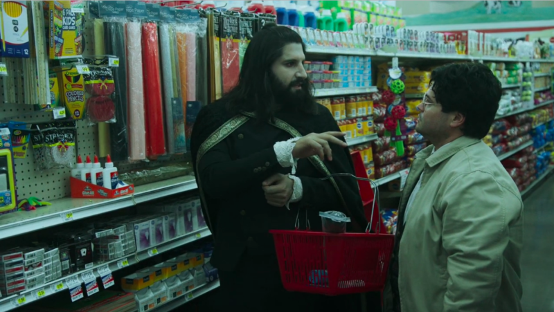 The costuming is also spot on (the giant lace collar worn by Berry is probably now my most favorite of things), and by having their wardrobes stuck in the time period in which they were turned, it really serves to highlight the absurdity of vampires trying to exist in an increasingly modern world. Nandor’s billowing cloak as he walks down the office and craft supply aisle of the local grocery store (“Creepy paper!” “It’s crepe paper” “Creepy paper!”), Nadja’s overly wrought curls, even the Baron’s armpit flaps and lack of genitals (“His lack of genitals is what makes him such an excellent lover.”) are all just so freaking perfect and hilarious. Even when Nandor tries to make a topical joke for the Baron (he covers his face in glitter “like Twilight!”), it’s still over ten years out of date and only highlights how out of touch he is. However, the best (and most meta) gag of the episode, for me, was when the Baron was delivering his epic and bloodthirsty monologue about conquering America, when he stops dead and looks right at the camera in shock. He hadn’t realized there was a camera crew present, or probably even what a camera crew is/does.