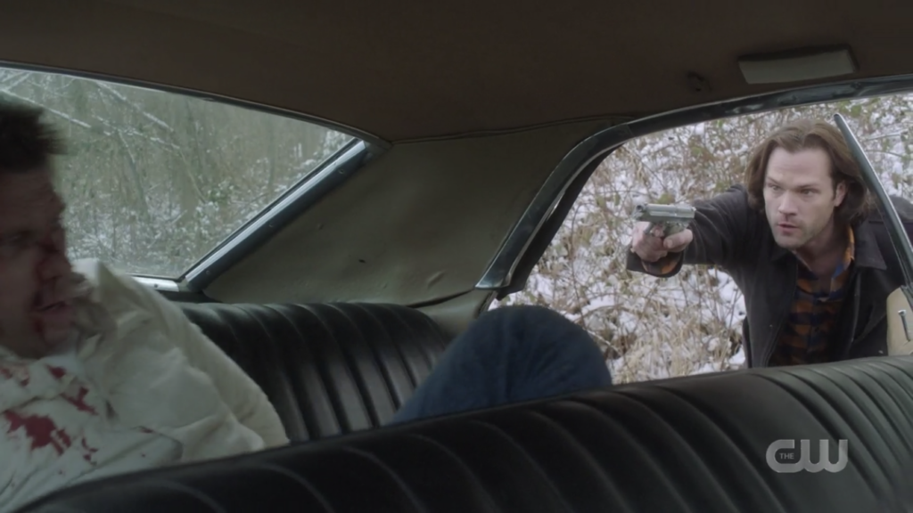 Disoriented, Sam is thrown against the Impala by Nick, once again mirrored with Dean throwing a demon against the wall. (I loved the direction of this episode!) Sam clearly struggles as Nick continues to punch him, even getting his hands around Sam’s throat. But Sam manages to break free, knocking Nick away long enough to get in the car and close the door, locking it quickly. Nick torments him through the window, and Sam honks the horn to get Dean’s attention. He is hurt and scared.