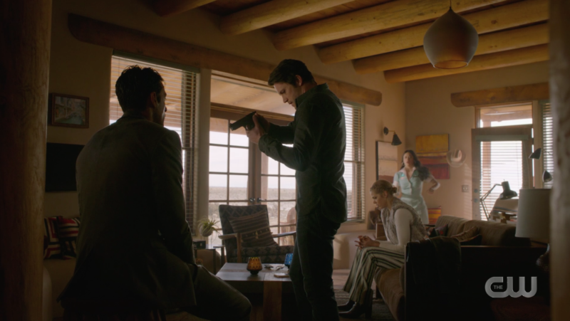 Isobel yells for Max and he runs in, gun drawn, as Isobel tell him not to shoot Noah so they can get some answers.
