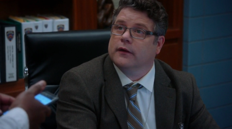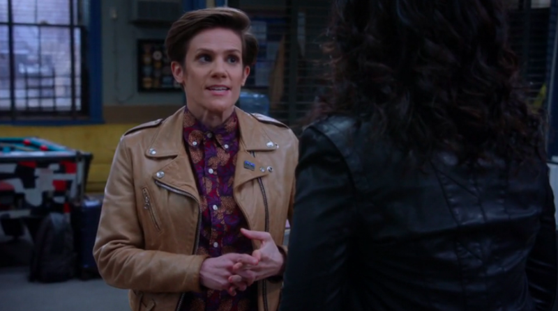 At the precinct, Rosa tells Jake that the internet is down and has been all morning. She also tells him that her girlfriend, Jocelyn (played by Cameron Esposito), is leaving town for two weeks, and wants to send her “flowers or something.” Rosa and Jake then watch Holt and the IT guy (Sergeant Knox, played by Sean Astin) and speculate. (“He’s upset!” “How can you tell?” “He’s pursing his lips and blinking in 8 second intervals instead of his usual 10. He’s clearly having a meltdown.”)
