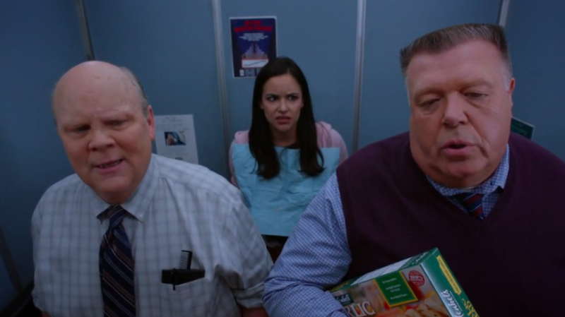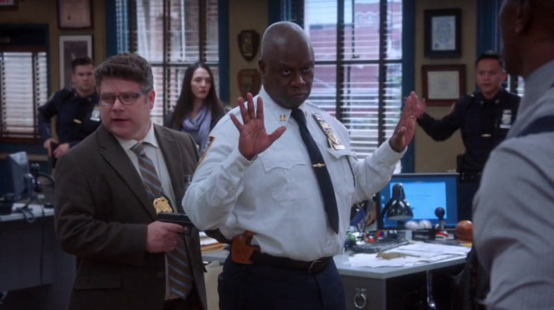 Holt receives the text (with 15 seconds to spare) and stalls in front of Knox, claiming that his husband texted him some “hot goss” that he must respond to. Unfortunately Knox catches on, and by the time Peralta and the rest of the team get off the elevator, he is holding Holt at gunpoint. He orders everyone to put their hands in the air. (“But the garlic bread! It’s going to burn!” wails Scully as he begrudgingly raises his hands.) Knox tells them that no one was supposed to get hurt, that he had planned this specifically because he knew Amy was going to be at the dentist and wouldn’t be there to recognize him. At this point, the burning garlic bread starts to smoke, which triggers the fire alarms. The alarms distract Knox and Terry and Jake are able to knock him over and disarm him. They cuff him and escort him into the lockup full of sorority sisters. (“Uh oh here he comes ladies! Look at this loose fit pants! And is that a braided belt?”)