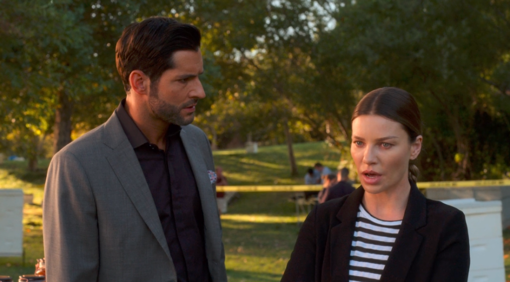 They took to the local farmers market to see if they can find a suspect. In the meantime, Chloe takes a moment to explain that it’s not actually all that funny, the way Lucifer was duping Ella. Because in her mind, the truth is so fantastical, she can’t help but understand why people would tell themselves it’s impossible. Seizing an opportunity (since Chloe is so down with his “devilishness”) Lucifer offers to show her his mojo in action at a rival honey stand. The owner, Glen, is quick to fall under Lucifer’s charms, revealing that he wanted to kill Bob (the dead beekeeper). It would seem like case solved, but the truth was Glen had been terrified of Bob. Sure he’d destroyed Bob’s beehive, but in retaliation, Bob had show up at his door and with calm, cold precision, beat the crap out of him with a sack of doorknobs.