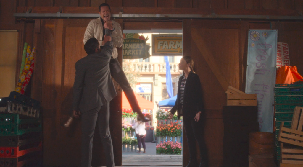 As they leave the farmer’s market, Chloe notices that they’re being followed. They cut out into some kind of shed to wait the guy out. Lucifer offers to use his “devil strength” and Chloe begrudgingly agrees. She’s quick to tell him to stop though, and while he assumes it was because she was finally telling him she wasn’t okay with who he is, it’s really because the guy Lucifer is assaulting has a badge.
