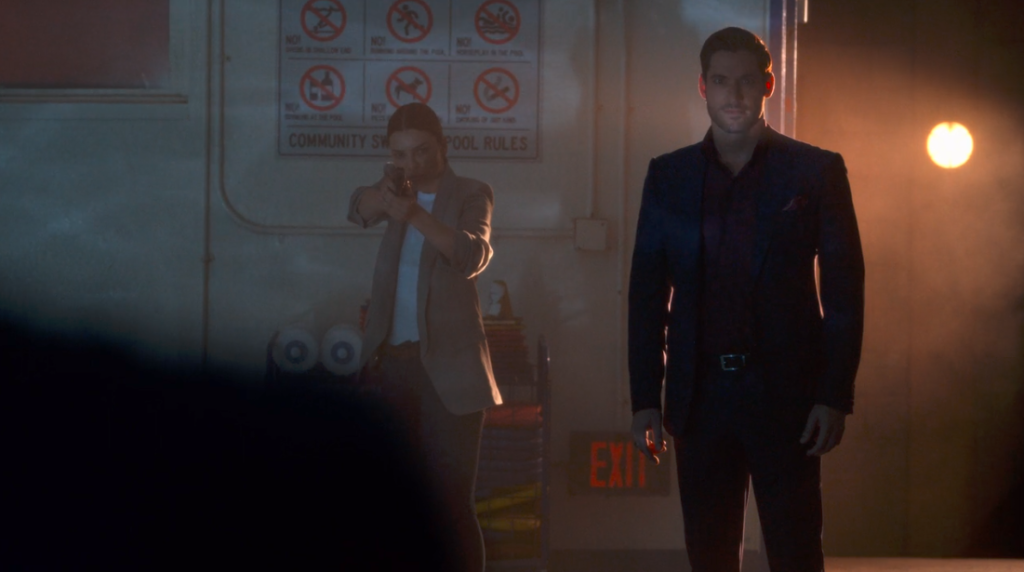 With all signs pointing to the handler as the murderer, Chloe and Lucifer track him down as he’s about to kill Lenore using the crime family’s MO. He’s bitter as hell, having to protect all of these criminals that basically got away with their monstrous things because they could turn state’s evidence, and he’s been framing these murders after the people that wanted them dead. This strikes a nerve with Lucifer, who obviously is trying to make up for his past transgressions, and this man was killing people who were actively trying to change their lives for the better. They fight, and Lucifer is shot in the hand while Lenore is pushed (whilst tied to a chair) into a pool. Chloe dives in to save her, while Lucifer runs after the handler.