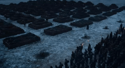 Jon makes a stirring speech in honor of the many who have fallen, and he, with others, goes to light the funeral pyres. Each character ignites the pyre of someone important to them or their survival. With a heartbreaking score the only sound in the scene, we see the pain and devastation on the faces of the surviving characters as they look upon the extensive loss of life suffered. The scene ends with an aerial view of the many, many pyres burning and it fades into nothing but smoke.