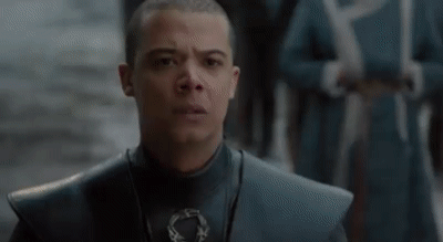 In King’s Landing, Cersei is shown watching as the people filter into the Red Keep to “be safe from the Dragon Queen.” She receives the news of the dragon’s demise from Yuron and rewards him by saying that she will rule the Seven Kingdoms with him by her side ruling the sea, and their child (how many different guys are you claiming as Baby Daddy now, Cersei?) will one day rule over all. Cersei, knowing that Dany would hate to murder so many innocents, orders for the gates to be left open to the people. As she walks away, we see Missandei in chains shivering.