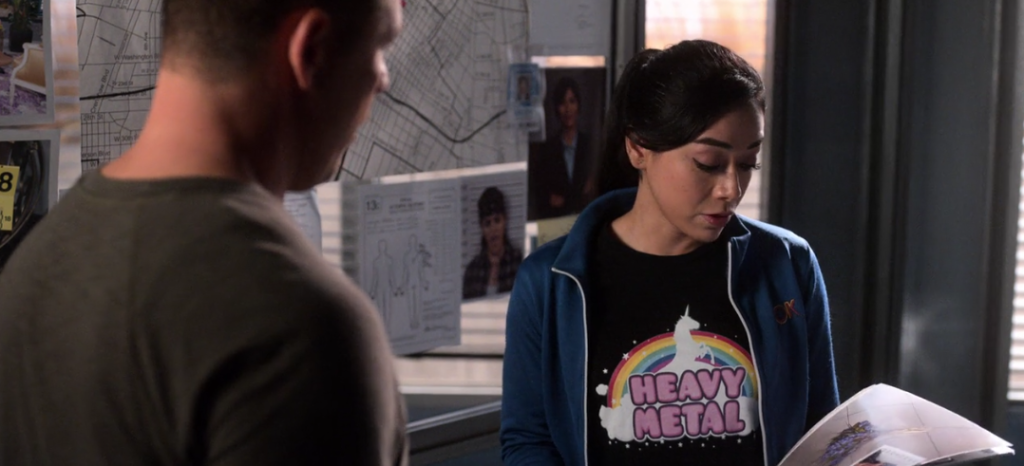 Ella (Aimee Garcia) is having a crisis of faith so significant that she reaches the point of removing her cross necklace. She has seemingly stopped going to church on a regular basis, and she has been drinking tequila lately as well. But she still rocks the best t-shirts.