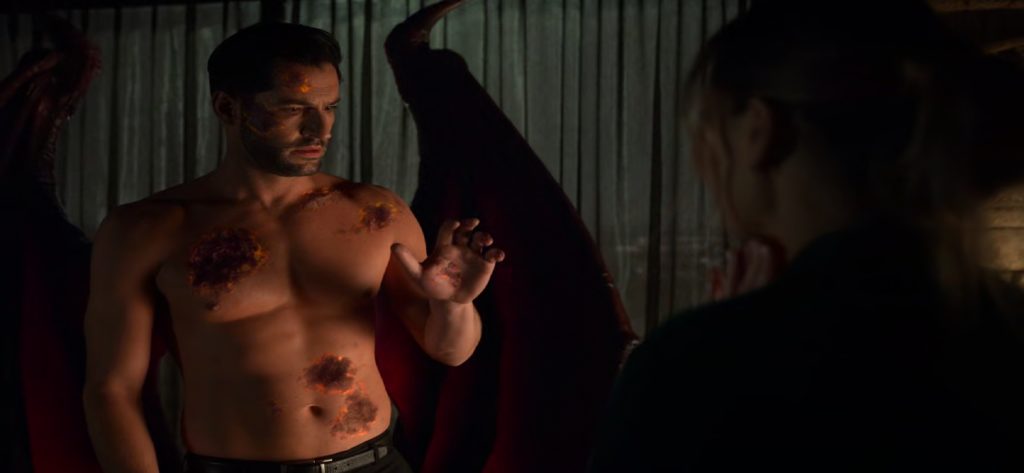 Lucifer knows why he hates himself. “Because everything I touch, I ruin.” Chloe has a hard time looking at him at first but tells him it is not about her but him and that she is okay. “If I turn around, will you be fine or will you look away in horror?” he asks her.