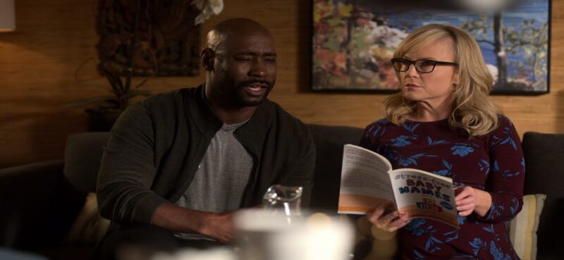 Amenadiel and Linda are talking about names for the baby. Linda wants mainstream names like Jack, and Amenadiel angel names like Azmortiel, which is mainstream in the Silver City. Linda remarks he won’t live there and Amenadiel agrees, clearly hiding something.