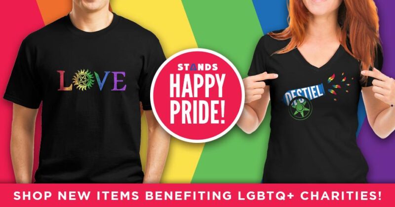 Rounding out the announcements of new merch is the SPN Pride Tee. This tee displays the famous Supernatural anti-possession symbol in all its rainbow glory. Proceeds from this tee will benefit the It Gets Better Project and is a great way to celebrate pride this month and all year round.