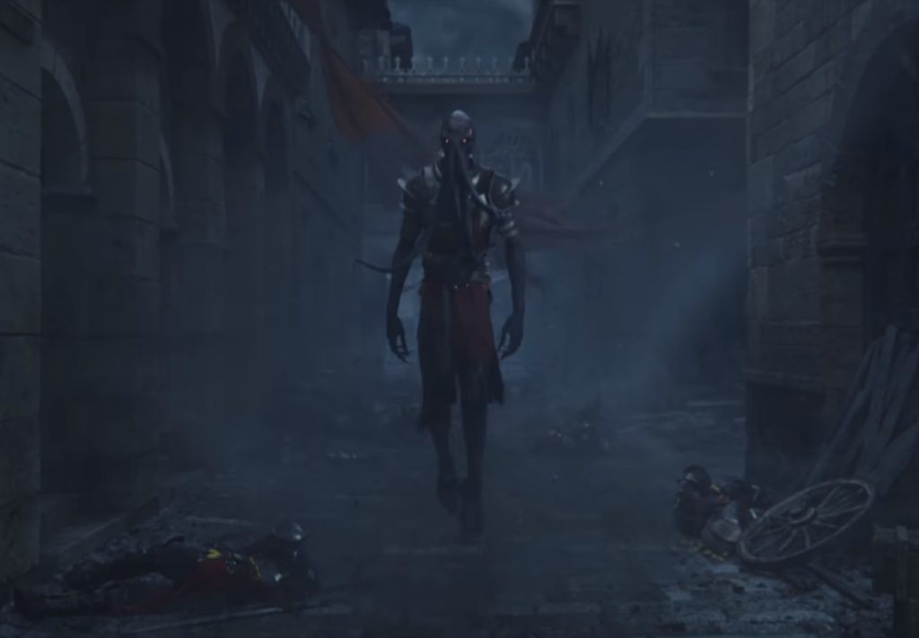 The trailer shows a knight with a flaming fist insignia on his tabard (something people who have played the original games will most likely recognize), stumbling around the corner of a building in obvious distress. The next part is nothing for the squeamish since there is a very graphic transformation that shows the knight taking on the new form of an Illithid, or mind flayer, one of the nastier monsters you can come across in D&D. It seems as if Baldur’s Gate is being overtaken by these creatures, who usually inhabit the Underdark, but now have come up to the surface to attempt to regain their former glory.