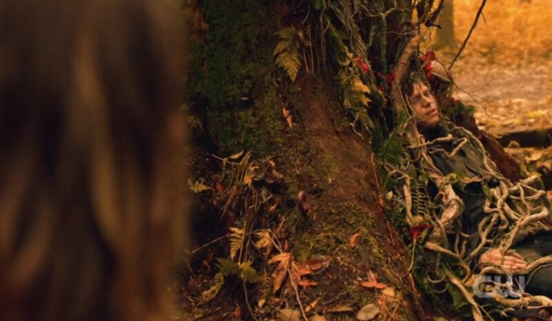 Meanwhile “I’m Going On A Bellamy Hunt” Echo finds the foraging party, sans Bellamy, and also finds a guy crying out for mercy as he is, literally, being swallowed by vines. Look: