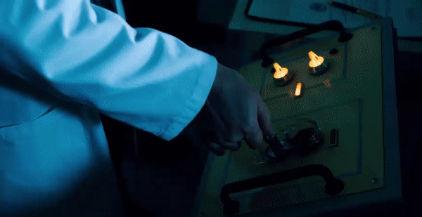 Episode one’s “Suzie, Do You Copy?” starts out in a laboratory, with men in white coats preparing something that looks very important. All the big wigs are there to observe, and the date of June 28, 1984 is displayed on the screen. (So this is taking place about four months before the start of our Halloween-centered second season.) Two white coats insert keys into an ignition device and turn them simultaneously. This activates some sort of reactor or generator at the center of the laboratory, and its wheels turn furiously and electric arcs sizzle all about.