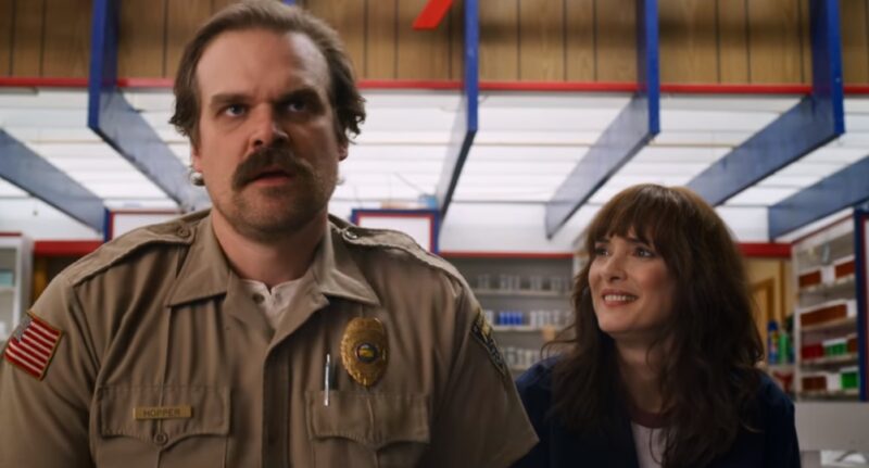 In town, Joyce is at work and is visited by Chief Hopper, who needs some serious help dealing with the wild child he lives with. He wants to murder Mike Wheeler, and suggests he could get away with it because he’s the chief of police after all, but Joyce offers to coach him on the finer points of having a heart-to-heart talk with the teenagers. (“A ‘heart-to-heart’? What is that?!” Hopper exclaims.)Â Joyce writes down a few key sentences for Hopper to memorize.