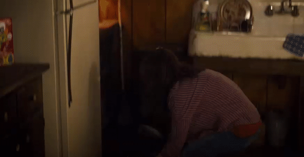 At the lab: Hopper and Joyce find a bunch of nothing. The gate is closed (thanks El!) and the cavities have been filled with concrete. Flashbacks of Will in peril in the Upside Down plague Joyce. She fears she’s losing her mind, but Hopper promises that he is keeping a close eye on the town so she’ll feel safe. He wants her to think of Hawkins as her her home. Oops. Cat’s (or Demodog’s?) out of the bag–Joyce consulted a (big-mouthed) real estate agent about selling her home. Hopper doesn’t want her to go. I suspect her kids will feel the same, but they don’t know about her plans to leave Hawkins yet. Joyce and Hopper have one of Joyce’s famous heart-to-heart talks. This time Hopper is honest with his feelings, but before things can go too far into the emotional territory, something bangs in another room. Hopper jumps up to investigate. We watch him draw his gun as a door creaks somewhere in the building.