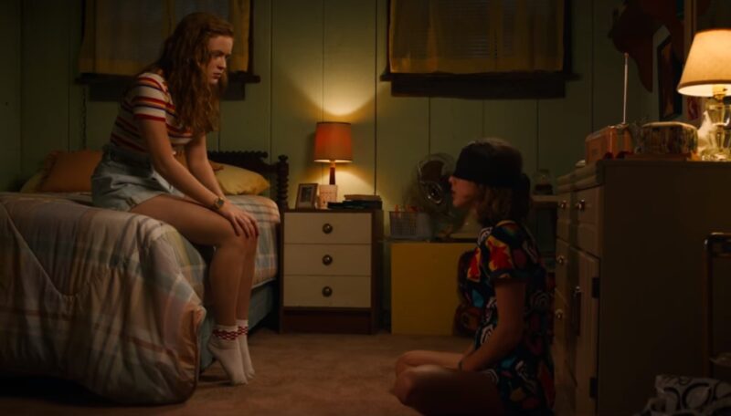 Hopper arrives home, drunk and depressed from his failed attempt at a date with Joyce. He storms into El’s room, expecting to find her making out with Mike again, but finds El and Max reading teen mags instead. Hey, at least his night will end on a more pleasant note. As he reclines in his chair, the girls play Spin the Coke* bottle to determine who El will mind-spy on next. You know, the Stranger Things version of prank calling! Mr. Wheeler, they say, is too boring to even attempt, but the next spin lands on a spicier (according to Mrs. Wheeler, anyway) choice: Max’s step-brother, Billy.