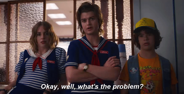 So, too, are Robin and a chest-perked-up Steve who believes he can knock out the guards… who have massive guns. Dustin asks Steve if he’s ever won a fight in his life…ever. Paying no mind to their banter, Robin rushes to the Scoops Ahoy register and takes the majority of the tip jar. She has an idea.