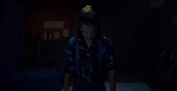 Inside the secret room, Steve opens a box to see what’s inside. Before he does though, he tells everyone to back up, just in case. Dustin lays on the friendship feels and tells him, “If you die, I die.” Steve pulls out what looks to be some sort of DNA, in glowing green goo. As they’re looking over the vials of whateveritis, the ground shakes, the lights flicker, and the room starts to free fall. They’re in an elevator that’s dropping hundreds of feet.