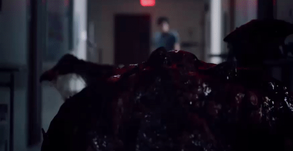 Now, here is where Stranger Things ups its strange quotient. Buckle up, because things are about to get disgusting. Remember the exploding rats from earlier in the season? Flayed Bruce and Tom break down into puddles of vaguely organ-colored, amorphous goo that begin to creep their way down the hall. The gelatinous remains come together and rise to create the form of a sentient creature: a screeching monster with sharp fangs.