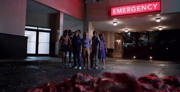 Back at Hawkins Memorial Hospital, we find our heroes (Max, Will, El, Mike, and Lucas) in the concession area waiting on Nancy and Jonathan. The lights are flickering, and Will gets his Mind Flayer chills and says the ominous “He’s here.” Upstairs, the goo monster that was created from Tom and Bruce’s remains is standing between Nancy and Jonathan and has his eyes on Nancy.