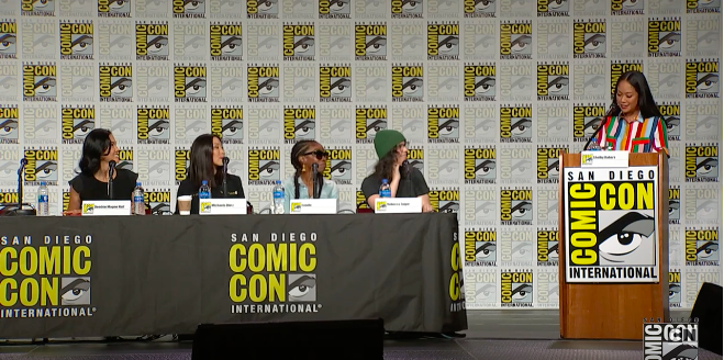 TheĀ Steven Universe cast panel this weekend at San Diego Comic Con featured Shelby Rabara, who voices Peridot and hosts the panel, the cast featuring Deedee Magno Hall (Pearl), Michaela Dietz (Amethyst), Estelle (Garnet), and creator/executive producer Rebecca Sugar.