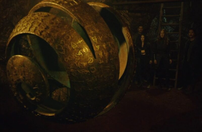 We pan out to ominous music. Gabriel is beside himself with the anomaly business. We follow him down to his secret underground lair and find a floaty round object with the same writing as Octavia’s back.