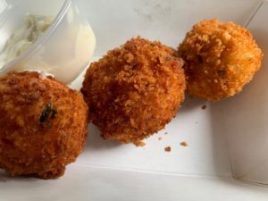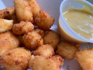 Next, we sampled from the Best Bites booth, trying the Reuben Croquettes and the Deep Fried Cheese Curds. Both of these came with your choice of dipping sauces, so we tried the basil parmesan mayo with the croquettes, and the maple-bacon honey mustard with the cheese curds. Both of these sauces complimented the bites well, and the food was cooked to perfection with a great crunch on them.