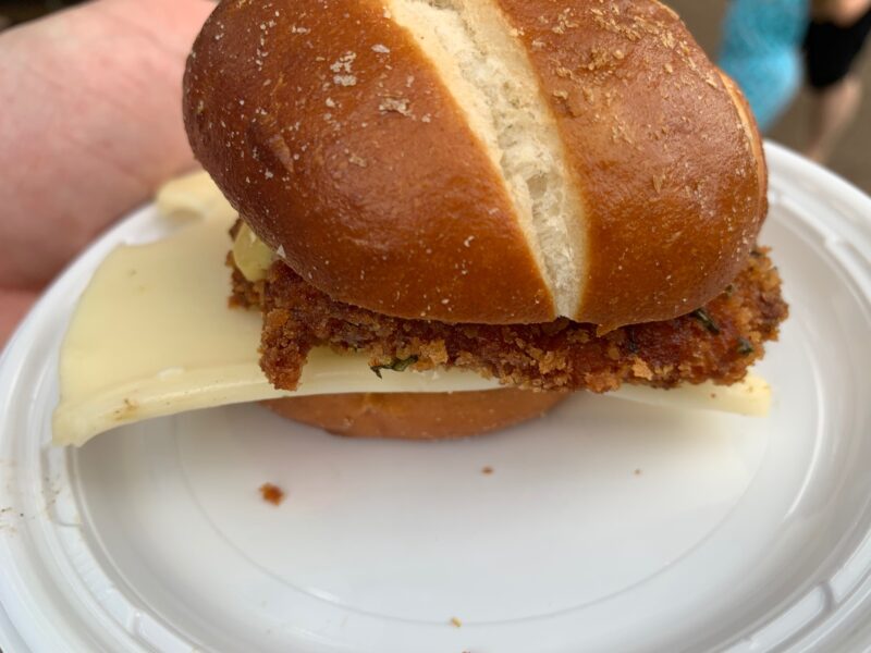 Up next, we went down to the Sip N’ Sliders booth, where they were serving Bison, Schnitzel and Bratwurst sliders. The Bison smelled amazing on the grill as you walked up to it, giving it that end-of-summer barbecue feel. We sampled the Schnitzelwich Slider, which was on a pretzel roll with swiss cheese and maple-bacon honey mustard. This might have been our favorite thing to eat out of the festival! It was incredible.