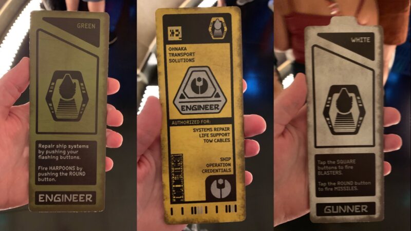 The ride has the regular stand-by line, a single rider line, and what will eventually be the FastPass queue. When you use the single rider line you do not see the pre-show with Hondo, and instead come in right before the Chess Room. Flight crews are taken from the stand-by line and completed with the single rider line, as needed. You are handed your credentials for your flight crew–a color and a flight role.