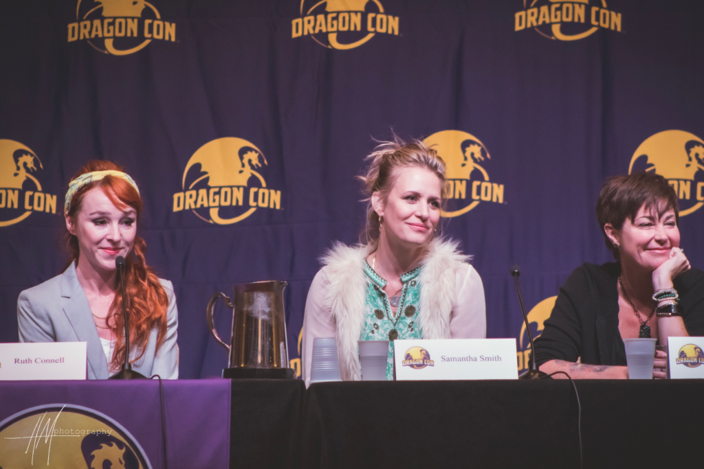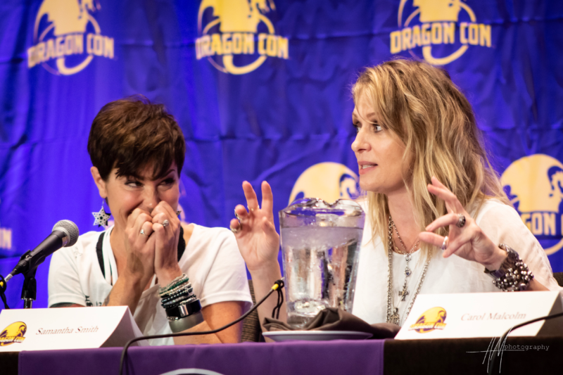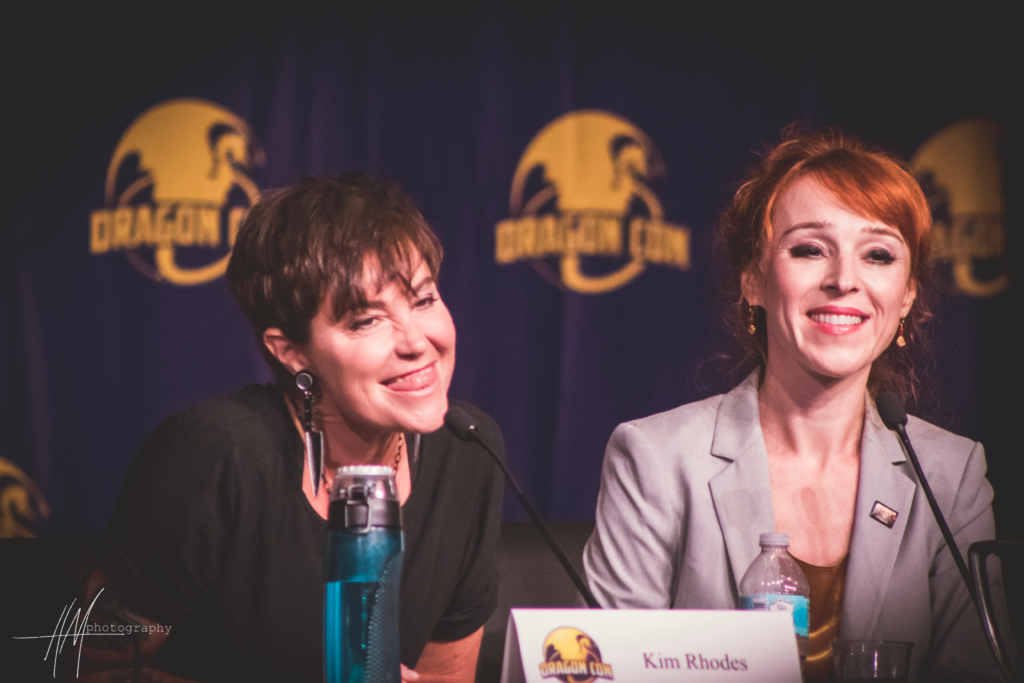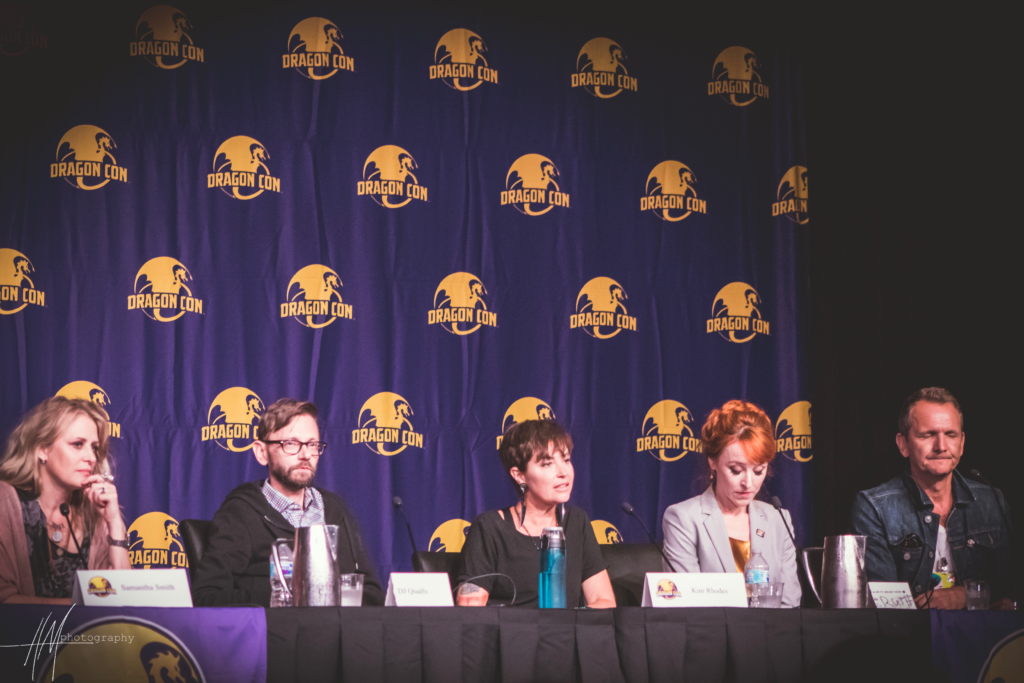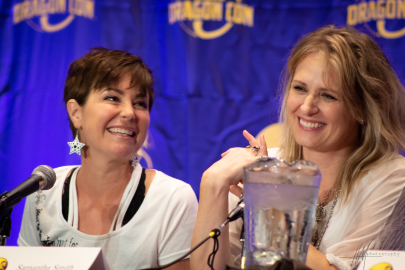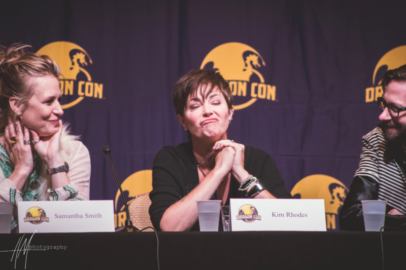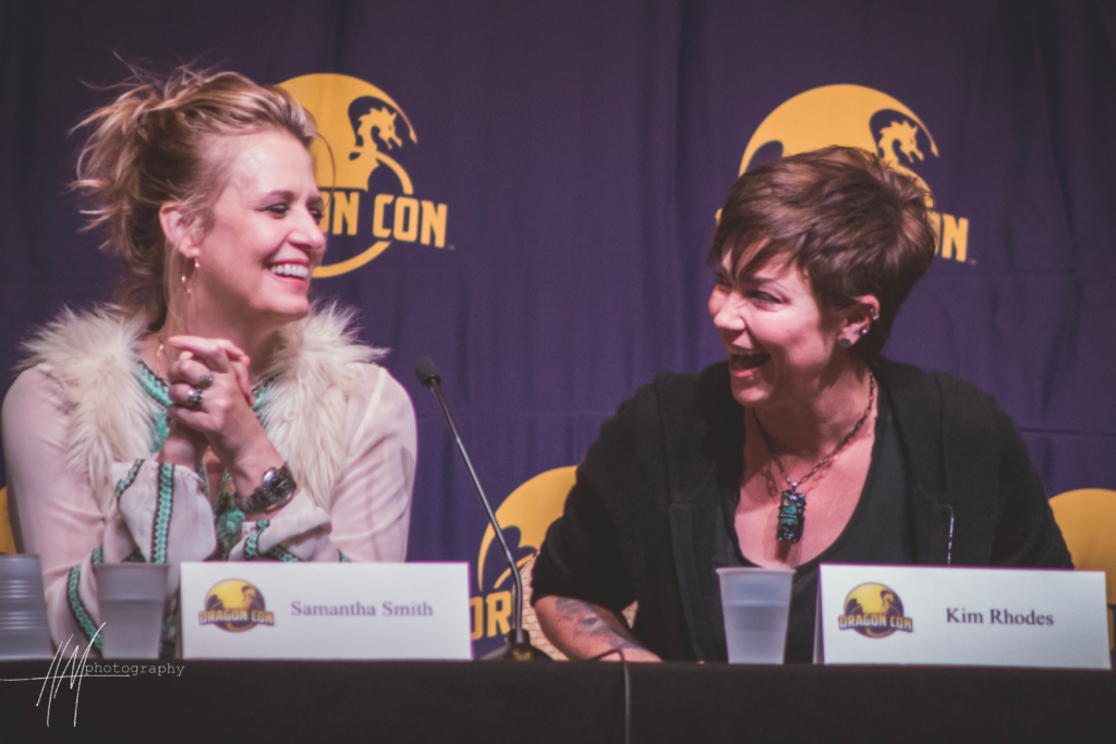 A little while later Kim Rhodes and Samantha Smith took the stage for what I’ve dubbed the “Supernatural Mom Panel.” This was the first time Kim or Sam had attended DragonCon and both found the format to be different than they were used to. Kim even tried to climb over the table, declaring that we, the audience, were too far away.