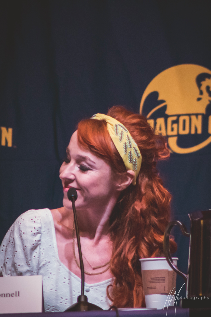 The Supernatural panel for Saturday was scheduled to include Samantha Smith, Kim Rhodes, DJ Qualls and Sebastian Roche, however we all got a fantastic surprise when Ruth Connell joined in the fun. Because she was not originally expected, there was no chair for our favorite red-headed witch, so of course, Kim offered her lap until one could be procured.