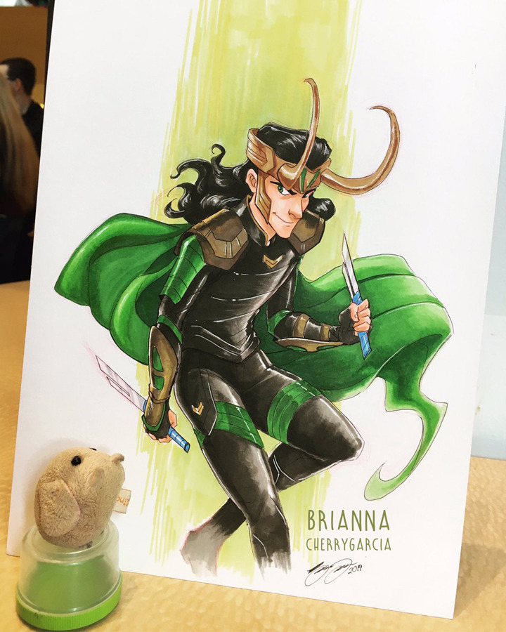Brianna Garcia: I did get to meet Tom Hiddleston at my first ACE event, and I was so nervous, but he was so kind, and it was so funny because I say this in every interview, but he’s so kind and gracious. I had a booklet of sketches of Loki I gave to him as a gift, and he said I should do a cartoon with these! Getting his approval is very rewarding, of course.