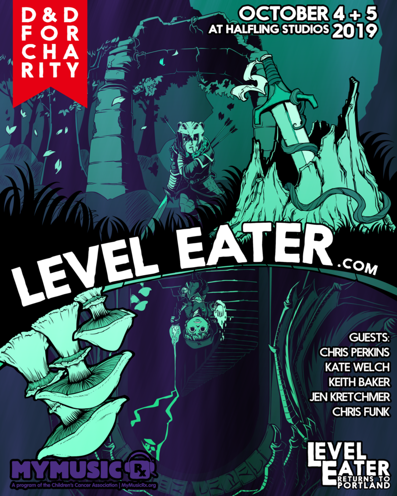 This weekend, Level Eater Adventures will be hosting a weekend of Dungeons & Dragons in the name of MyMusicRx, the flagship program of Children’s Cancer Association (CCA). Participants will gather at Halfling Studios in Portland, OR to play through a custom adventure written for the occasion. While all the tables will be playing the same scenario, the adventure features distinct quests, focused on exploration, combat, and roleplaying. At the stroke of midnight, the players will gather to see if they were able to save the realm of Greenmoss or not.