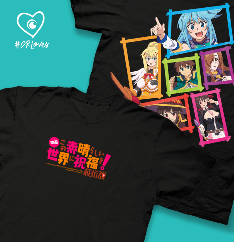In celebration of the movie’s premiere, Crunchyroll is releasing an exclusive KonoSuba collection from the in-house streetwear line Crunchyroll Loves. The collection includes a unique shirt with artwork from the film. It will be available to purchase in early November only at the Crunchyroll store. They are also going to be launching a new app that comes with a sticker pack in chibi style of Kazuma and the rest of the group. You can download the app here.