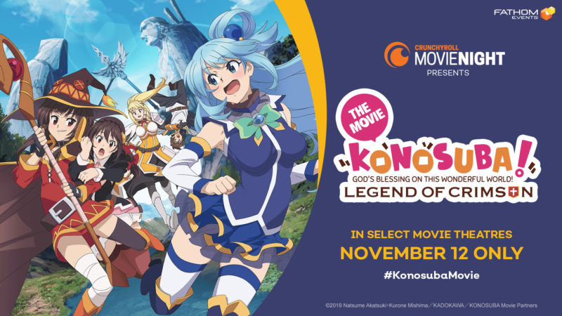 The next Crunchyroll Movie Night with Fathom Events will be the U.S. premiere of KONOSUBA – God’s blessing on this wonderful world – Legend of Crimson. The movie is a new adventure from the popular KonoSuba anime series. Fans can watch the film in more than 600 theaters across the country on Tuesday, November 12 and encore on Friday, November 14.