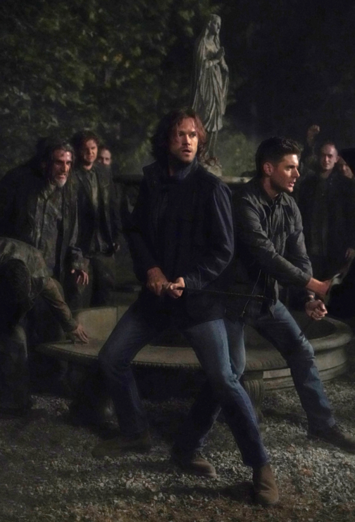 We start this episode by descending from the pits of Jack’s burned out eyes and into the background of Team Free Will fighting off hellish souls inhabiting the bodies of the dead. There’s too many of them clawing, wanting any piece they can have of them and instantaneously we are reminded that the stakes are incredibly high this season. There’s no aged taco or hellhound, only the atomic bomb of the remaining episodes as they will fly by. Castiel scoops Jack up into his arms and Dean fights through with each run closer to their getaway bringing behind an explosion of another ghost from the graveyard. This scene was a personal favorite of mine simply from an aesthetic purpose. Then came this season’s title cards and I’d like to link you to a very detailed analysis over on Twitter.