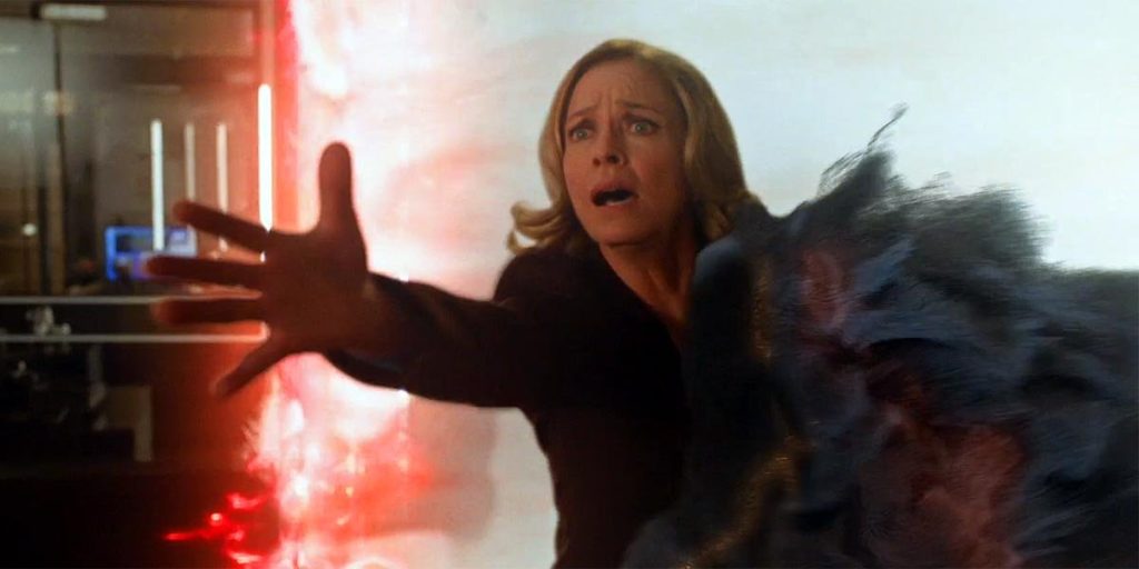 Before leaving, Oliver meets Tommy at SCPD. Tommy says he can’t shake the feeling that Thea would still be alive if Oliver had still been there. Oliver says goodbye to Moira, who doesn’t understand what’s happening. Just as they’re about to leave, the city is under attack. Anti-matter is destroying Earth-2 and everyone in it. Oliver, Diggle, and Laurel escape back to Earth-1, just barely missing the anti-matter before it destroys them.