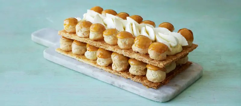 For the technical challenge this week, bakers were given a recipe they had never seen before and were asked to produce a rectangular Gateau St. Honore. The bakers had three and a half hours to produce the gateau which consists of two layers of puff pastry with choux buns filled with chiboust cream and dipped in caramel and decorated with chantilly cream.