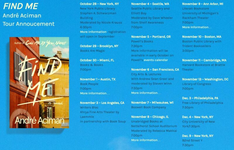 Aciman will be hitting the road on a Find Me Book Tour, which started October 28 in NYC. Check out the dates to see if he’s coming to a location near you!